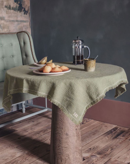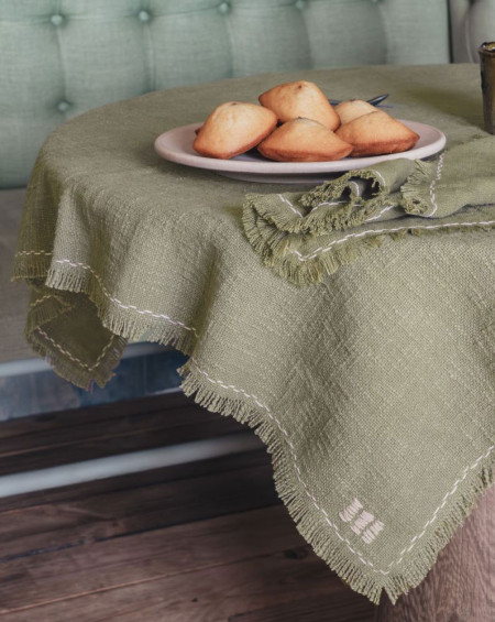 Sous la lumière du midi, la mini-nappe Mozzarella en coloris Pesto évoque les déjeuners d’été à l’ombre d’un figuier. Ce vert doux, légèrement patiné, semble avoir capté la fraîcheur des herbes et la lumière des jardins. Tissée en coton flammé, elle possède ce grain irrégulier et vivant propre aux matières naturelles : un toucher vrai, presque artisanal, qui raconte la main de celui qui l’a tissée.